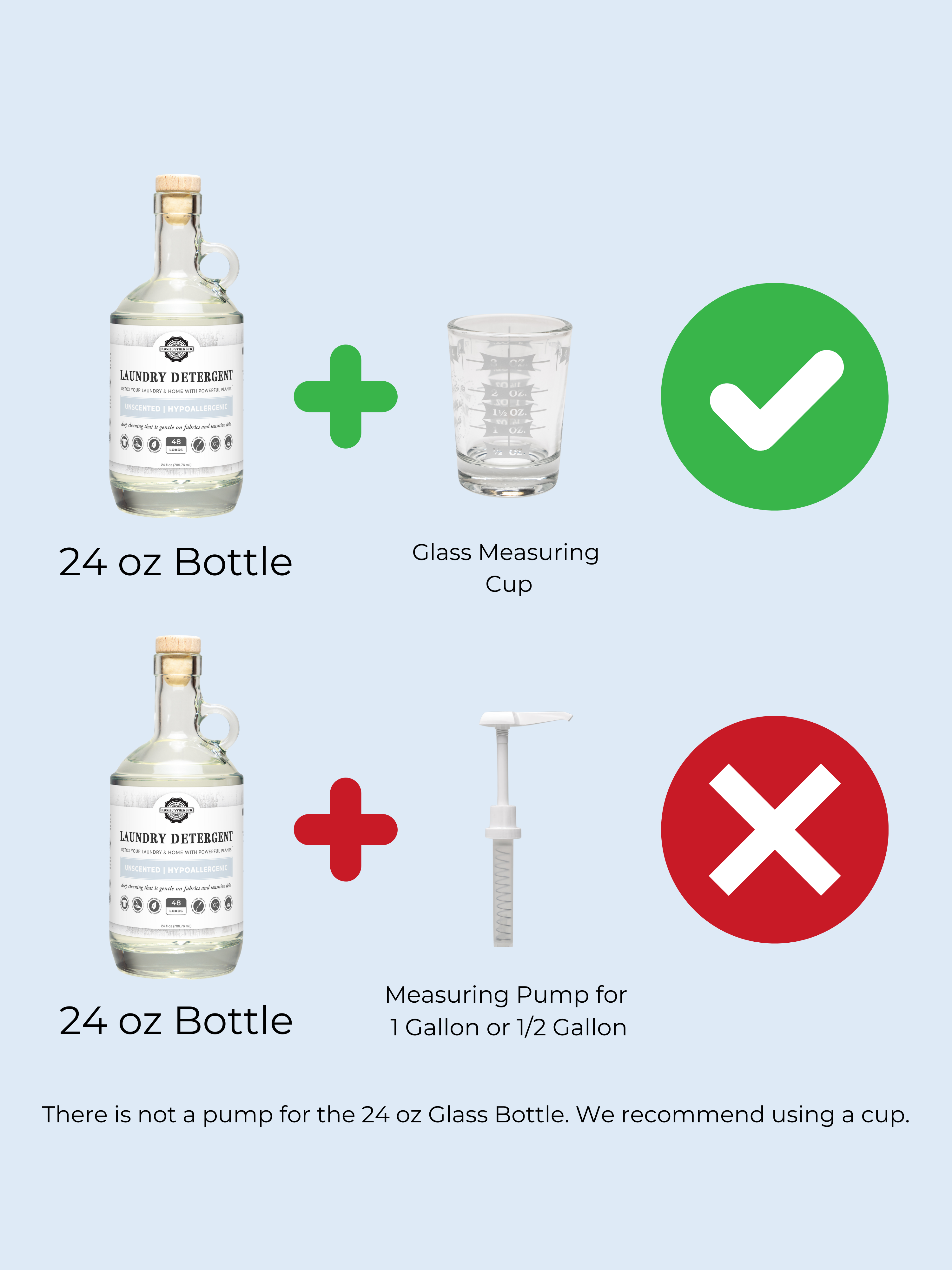 This pump fits our 1/2 Gallon Plastic Jugs (64 oz) only. These pumps dispense a full 1oz when fully charged. The exact amount for a medium load of laundry.+